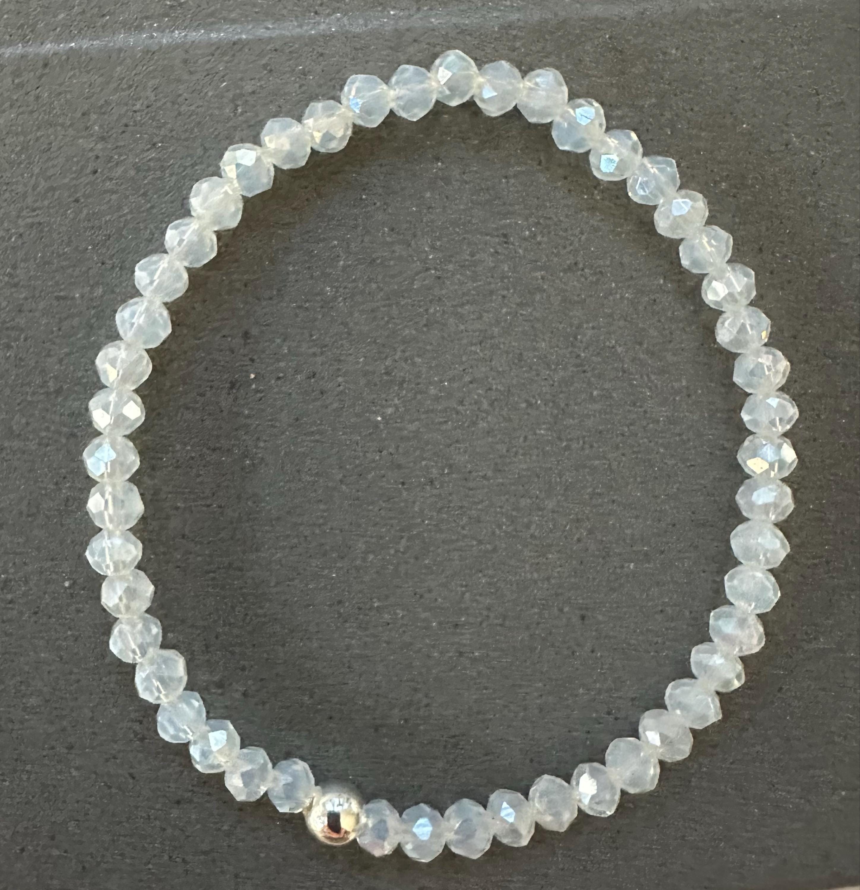 Beautiful handmade stretch bracelet with sparkly 4mm white faceted Opal rondelles crystal beads with a 5mm Sterling Silver, 14K Gold Fill, Ab or clear diamante crystal or No metal accent bead