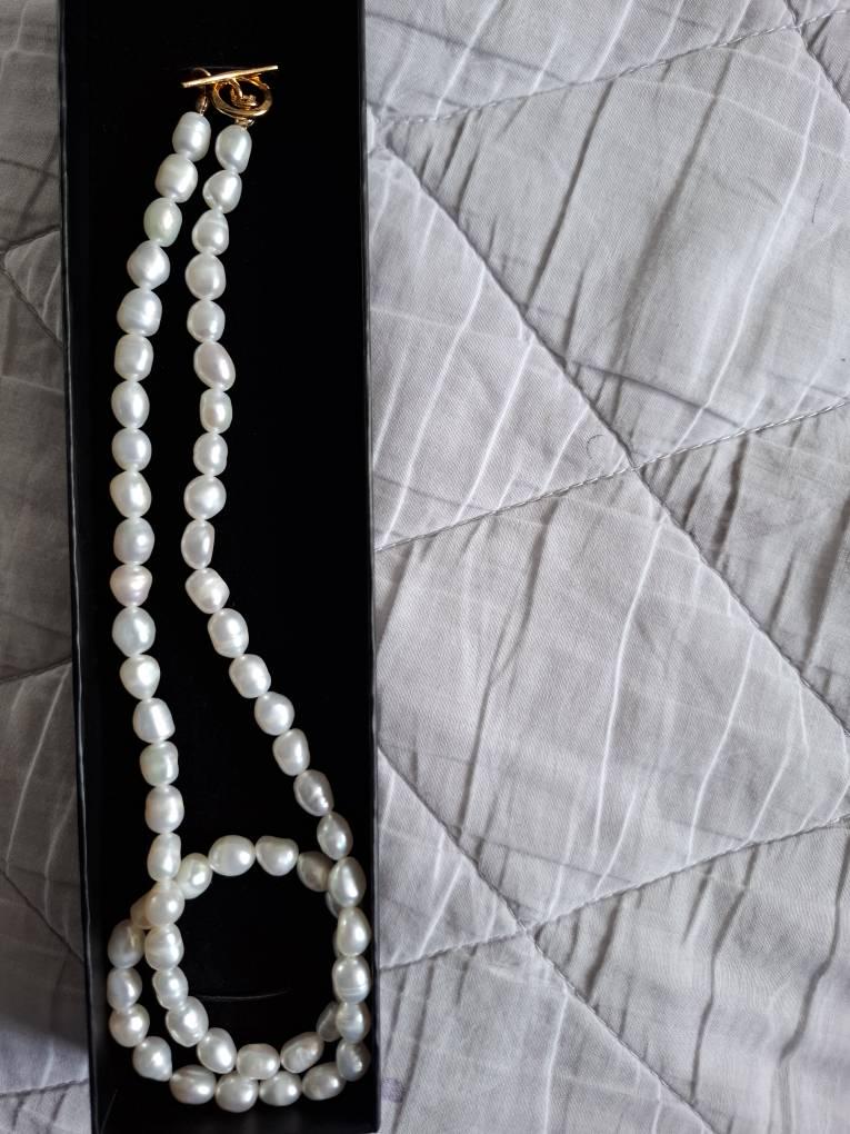 beautiful genuine high lustre AA 6.4/7.4mm white Baroque freshwater pearls, and finished with a pretty matt brushed 24K Gold Vermeil toggle clasp which can be worn at the front or back.