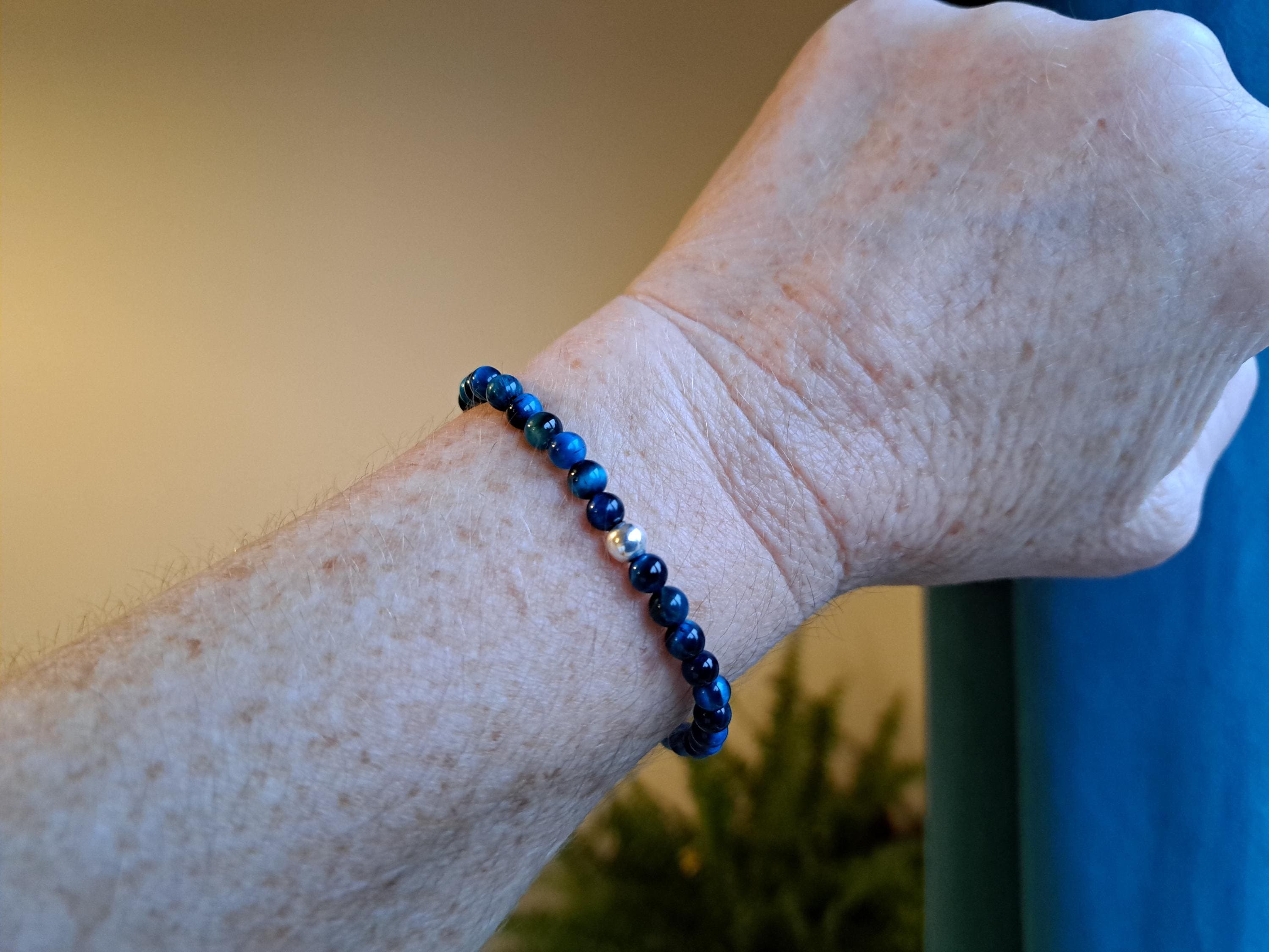 Beautiful handmade stretch bead gemstone bracelet with 4mm Blue Dyed and Heated Tigers Eye beads and a Sterling Silver ball bead or 14K Gold Fill accent bead or no metal accent bead,