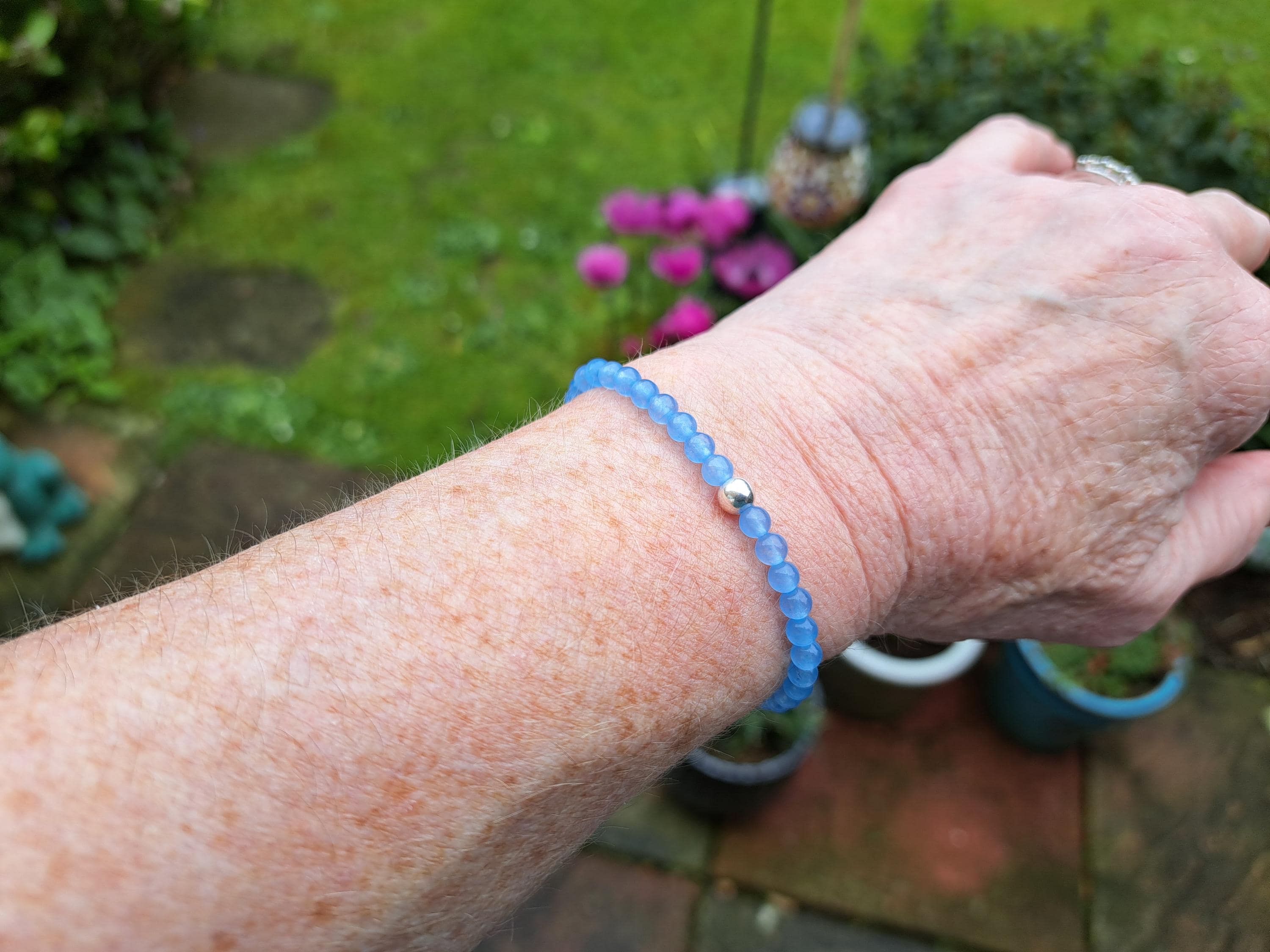 Very pretty pale blue bracelet from a seller who I have bought from several times. Looks great when stacked with my silver bracelets. Excellent quality, fast delivery, very helpful seller.