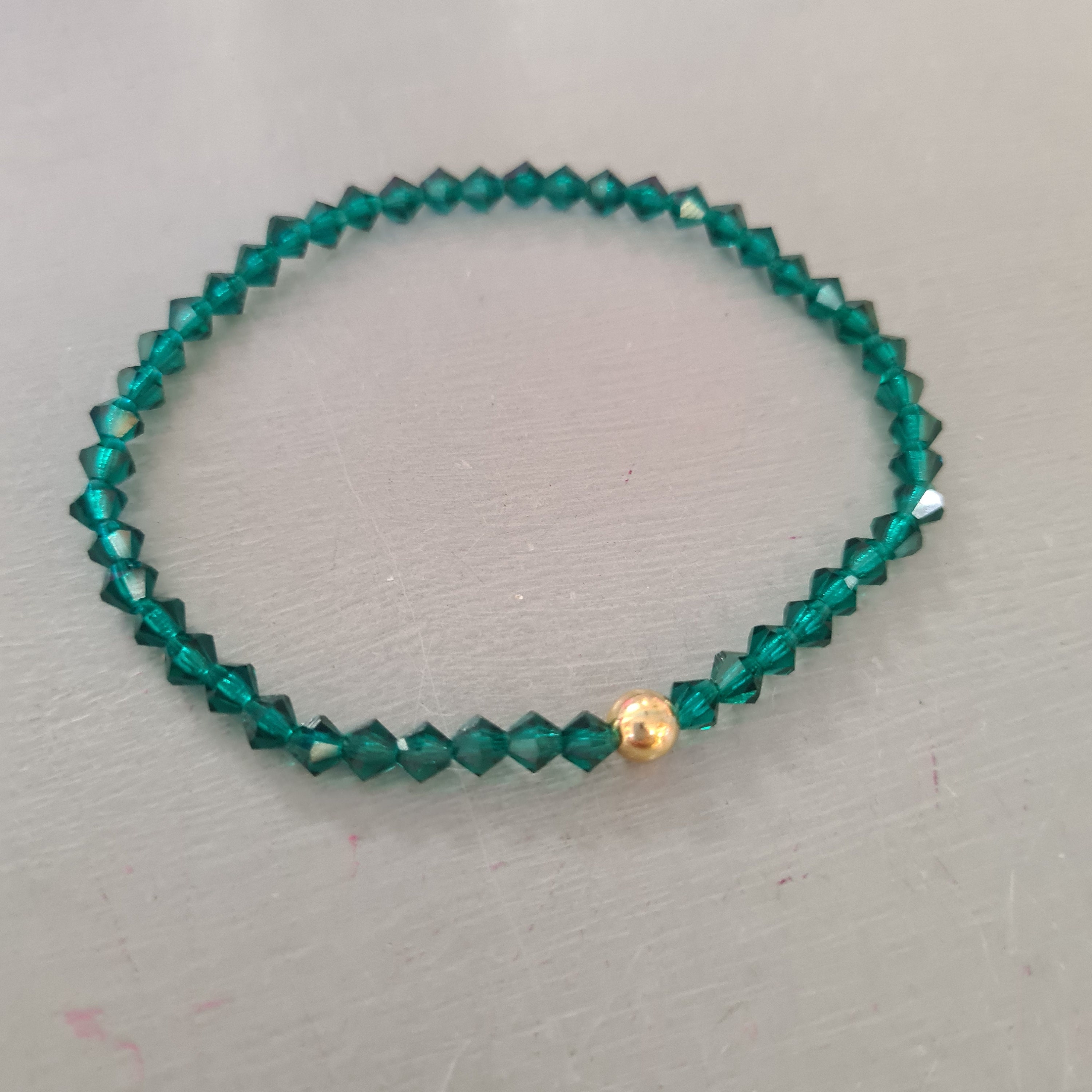 Beautiful handmade stretch bracelet with sparkly 4mm bicone Emerald green Austrian crystals and a 5mm Sterling Silver , 14K Gold Fill, clear or AB diamante or no accent bead,