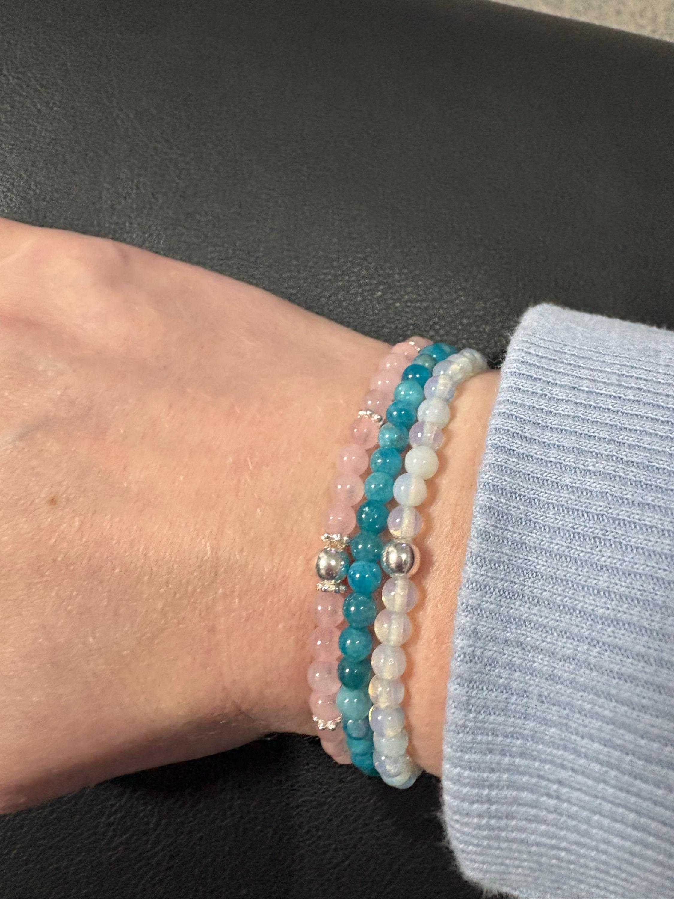 Beautiful tiny Rose Quartz stretch bracelet with genuine 4mm pink Rose Quartz gemstone beads , Sterling Silver ball bead and Sterling Silver tiny daisy spacers.This bracelet can also be made for you in 14k Gold Fill,